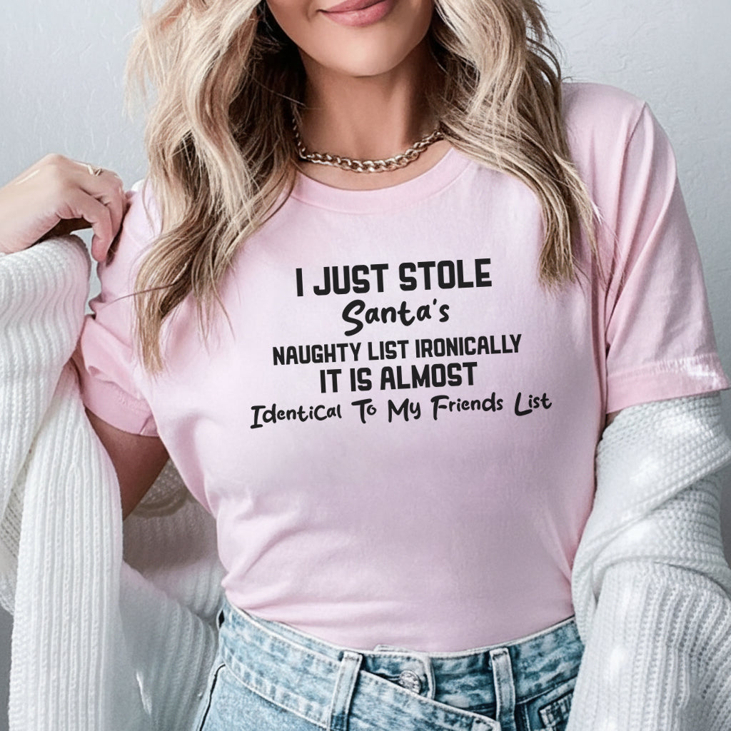 Cheeky, festive, and perfectly mischievous. The “I Just Stole Santa’s Naughty List… Ironically, It Is Almost Identical to My Friends List” T-shirt is for anyone who loves holiday humor with a side of playful sass.