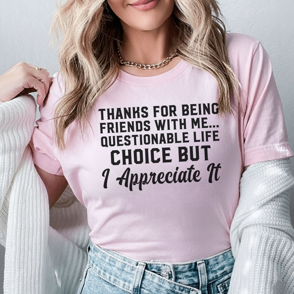Funny, playful, and perfectly sarcastic. The “Thanks for Being Friends With Me… Questionable Life Choice, But I Appreciate It” T‑shirt is for anyone who loves poking fun at themselves—and their friends.