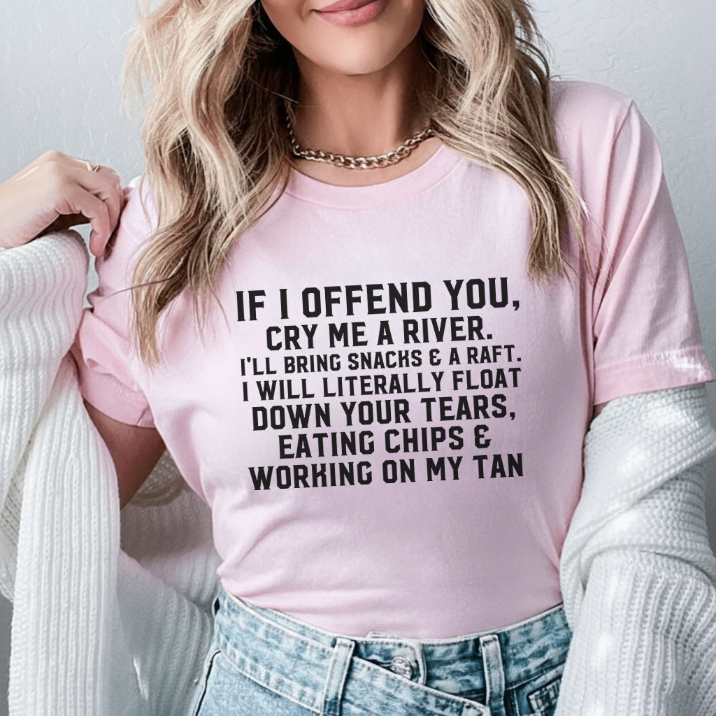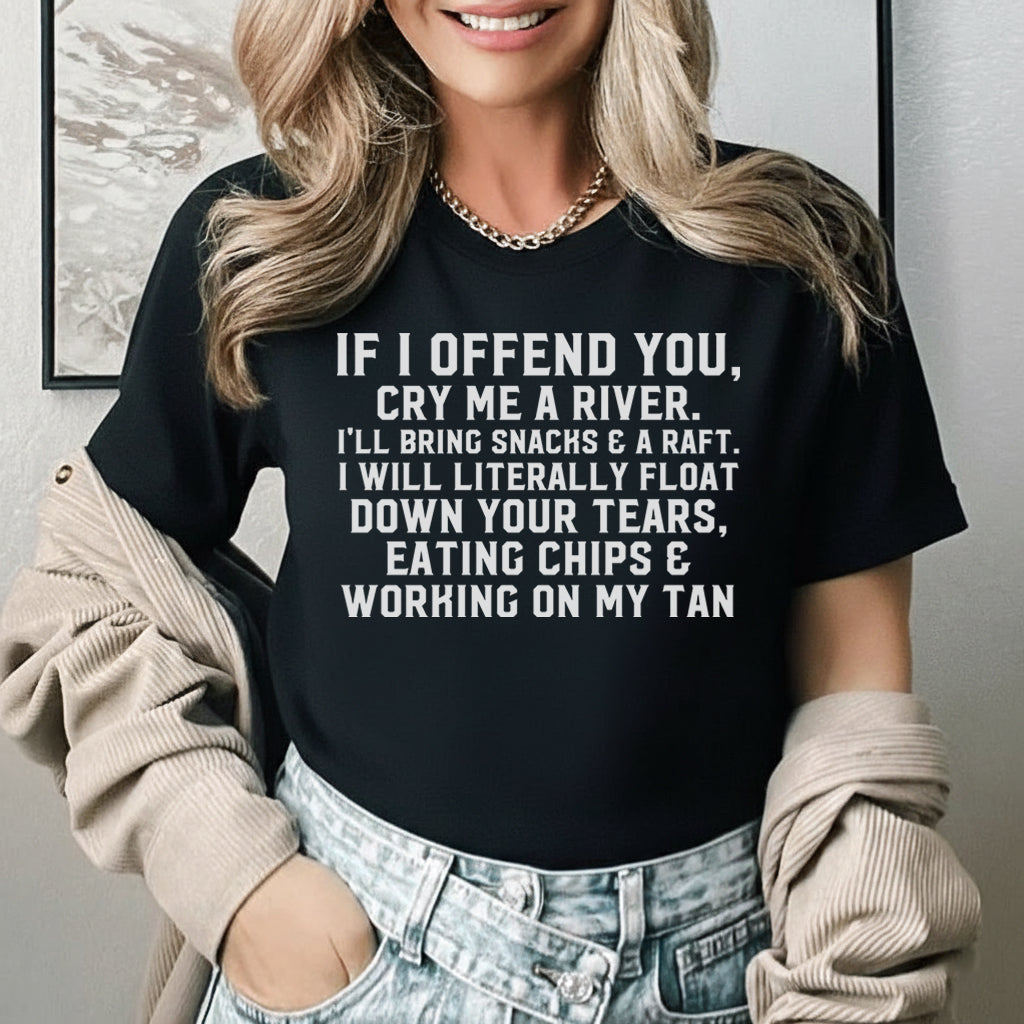 Savage, hilarious, and unapologetically extra. The “If I Offend You, Cry Me a River — I’ll Bring Snacks & a Raft. I Will Literally Float Down Your Tears, Eating Chips & Working on My Tan” T-shirt is for anyone who thrives on chaos, sarcasm, and having fun at the expense of drama.