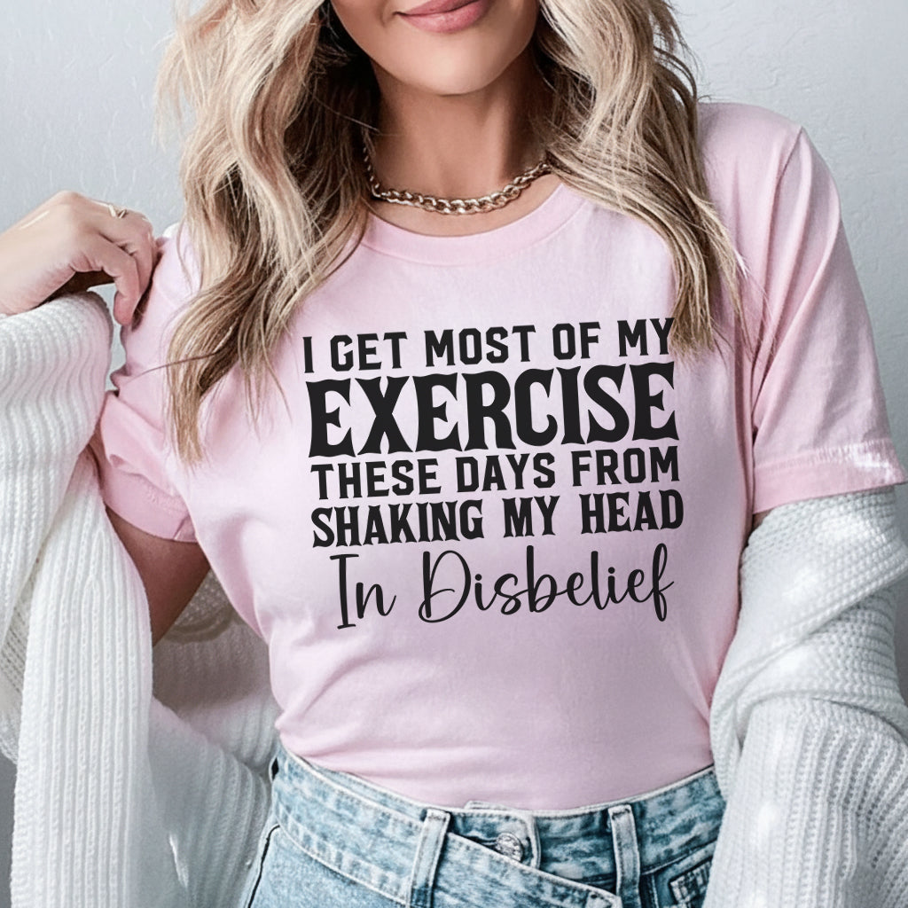 Funny, sarcastic, and perfectly relatable. The “I Get Most of My Exercise These Days From Shaking My Head in Disbelief” T‑shirt is for anyone who’s tired of nonsense but keeps surviving it with humor.