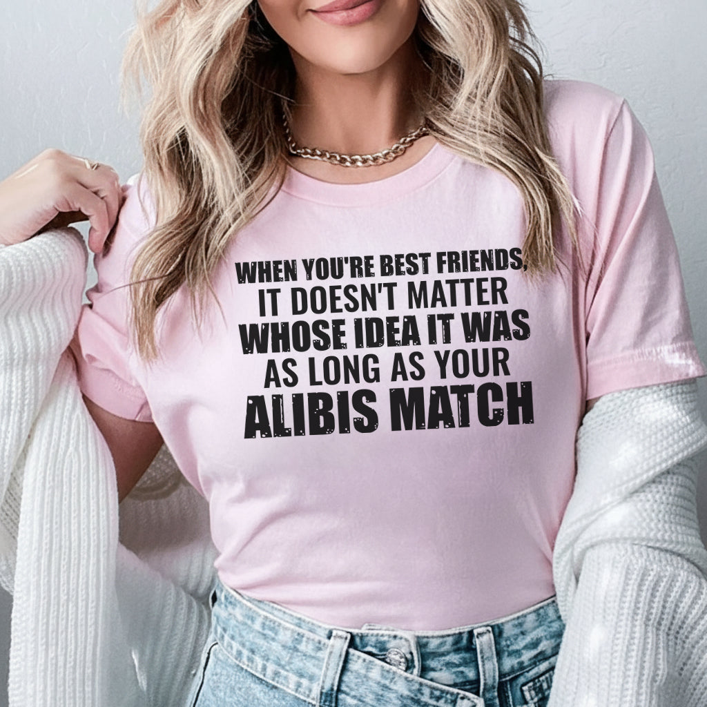 Playful, clever, and perfectly relatable. The “When You’re Best Friends, It Doesn’t Matter Whose Idea It Was — As Long As Your Alibis Match” T-shirt is for anyone who knows that friendship is built on mischief, loyalty, and shared chaos.