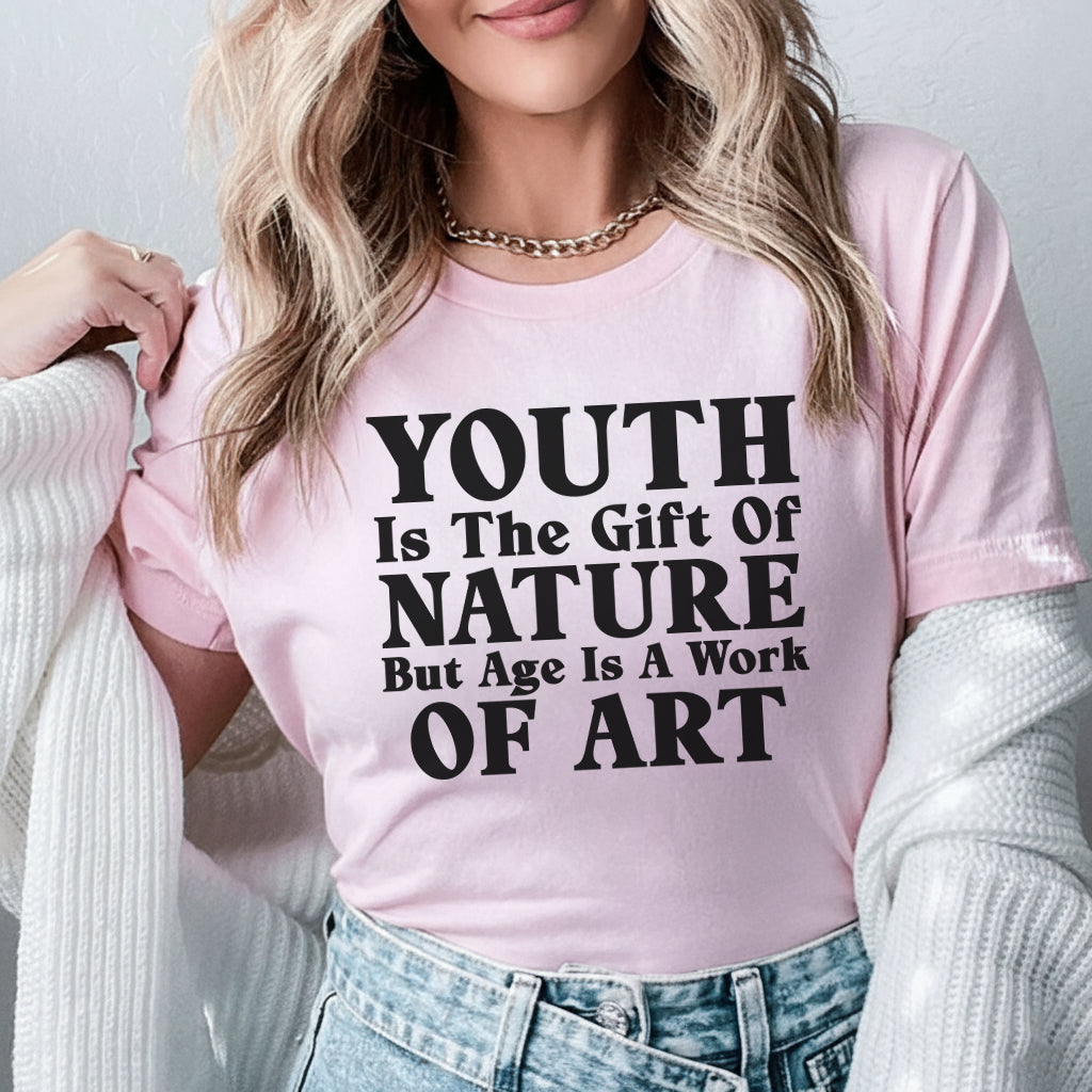 Elegant, inspiring, and perfectly witty. The “Youth Is the Gift of Nature, But Age Is a Work of Art” T-shirt celebrates the beauty of every stage of life — from carefree beginnings to seasoned wisdom. Because growing older isn’t just inevitable, it’s an opportunity to create something truly remarkable.