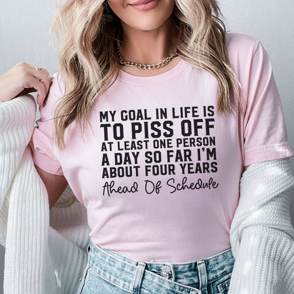 Hilarious, bold, and unapologetically mischievous. The “My Goal in Life Is to Piss Off at Least One Person a Day… So Far I’m About Four Years Ahead of Schedule” T-shirt is for anyone who loves stirring the pot and embracing their sassy side. Because some people were born to break the mold — and annoy a few along the way.