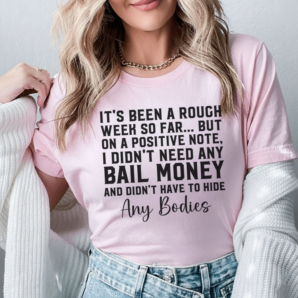 Darkly funny, clever, and perfectly sarcastic. The “It’s Been a Rough Week So Far… But on a Positive Note, I Didn’t Need Any Bail Money and Didn’t Have to Hide Any Bodies” T-shirt is for anyone who handles life’s chaos with a twisted sense of humor.